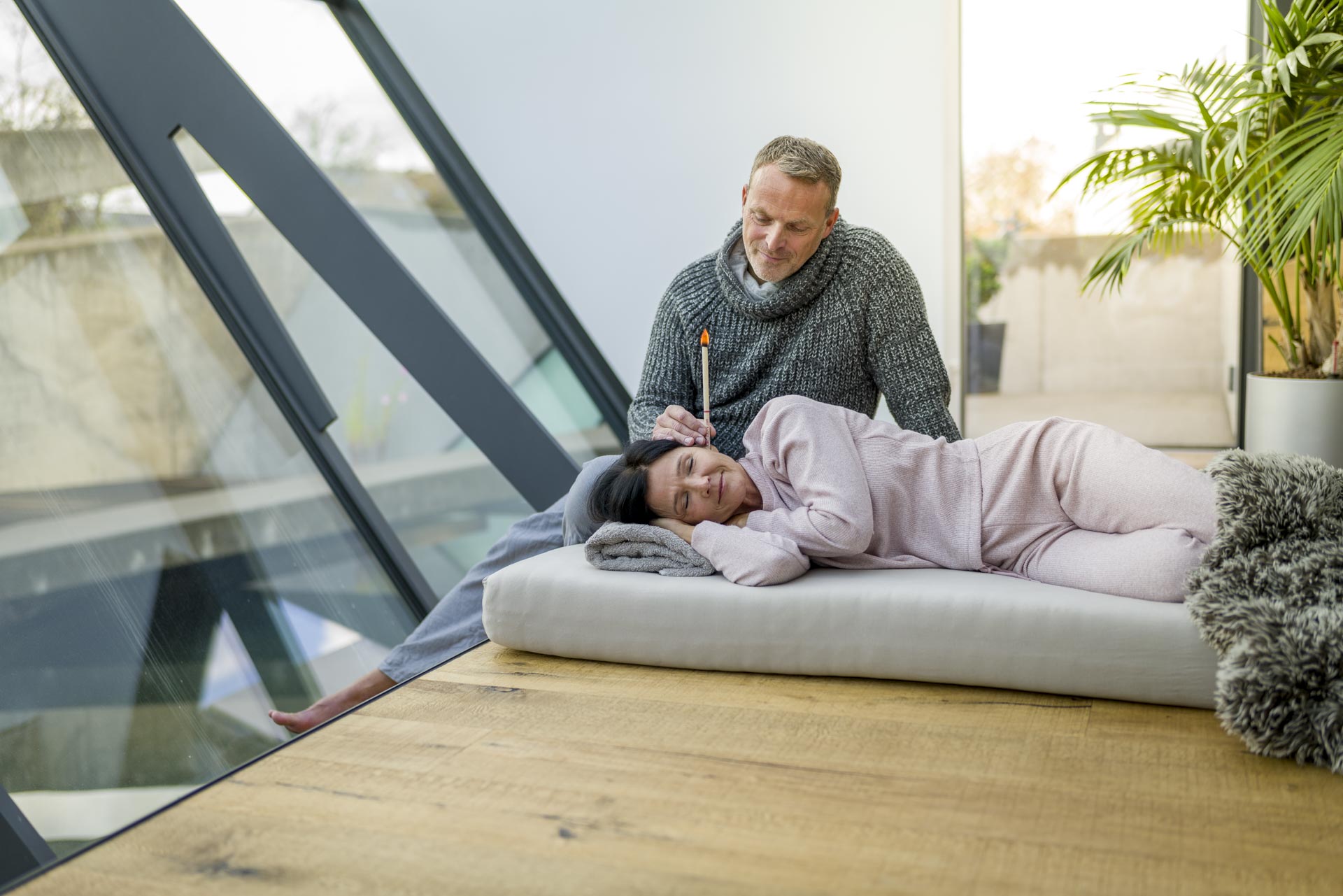Erschaffe Dir vor der Anwendung eine entspannte Atmosphäre. Dabei wirkt der Einsatz unserer Entspannungsmusik und unserer Aroma-Essenzen äußerst positiv. Mit geschlossenen Augen erfährst Du das Ohrkerzen-Erlebnis um ein Vielfaches intensiver. Der Raum darf nicht zugig sein. Die Flamme muss immer ruhig brennen. Halte Dich mit einer Decke warm. Am besten liegst Du in einer bequemen Seitenlage. Der Kopf ist mit einem Kissen unterstützt, der Gehörgang zeigt fast senkrecht nach oben. Während des Abbrennens können bei Zugluft im Raum kleine, kalte Ascheteilchen abfliegen. Um Haare und Kleidung zu schützen, kannst Du zur Vorsicht den umliegenden Bereich mit einem Tuch abdecken.